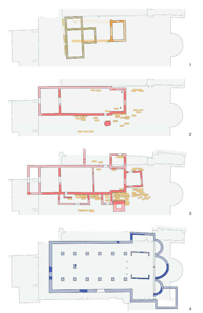 Abb. 2: Zusammenstellung der vier nachrömischen Bauphasen des Niedermünsters in Regensburg. 1: Völkerwanderung und Merowingerzeit (2. Hälfte 5. und 6. Jahrhundert). 2: Phase Karolingisch I/erste Kirche (8. Jahrhundert). 3: Phase Karolingisch II und III/Umgestaltung zur Stiftskirche (9. Jahrhundert). 4: Phase Ottonische Basilika (um 950). (Rekonstruktion: E. Wintergerst. Gestaltung: R. Röhrl. Bayerisches Landesamt für Denkmalpflege) HLB