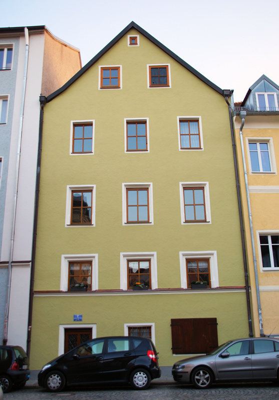 Massivbau mit Blockbaustube in der Silberne-Fisch-Gasse 7 in Regensburg (Foto von Johanning lizensiert durch CC BY-SA 3.0 via Wikimedia Commons)