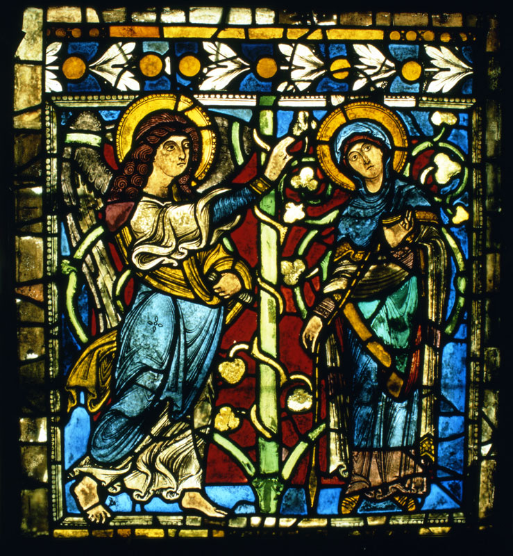 Verkündigung an Maria. Glasfenster aus dem Triforium des Südquerhaus des Regensburger Domes. Triforium. Das Fenster wurde aus dem alten Dom übertragen. Entstehung um 1230. (Foto von Achim Hubel)