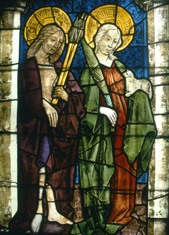 Hl. Sebastian und hl. Agnes. Glasfenster im nördlichen Seitenschiff des Regensburger Domes, 5. Joch von Osten, um 1450. (Foto von Achim Hubel)