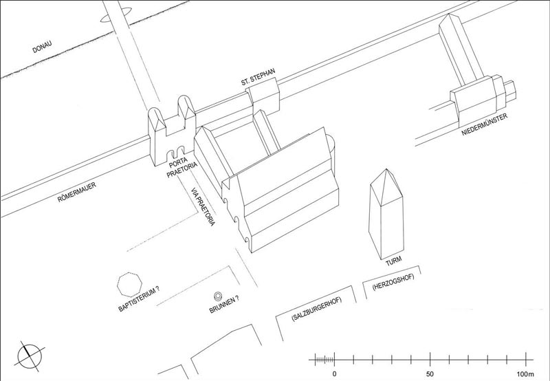 Rekonstruktion des Dombezirkes vor dem Jahr 1000. Isometrische Zeichnungen von Katarina Papajanni nach Karl Zahn und Untersuchungen von Karl Schnieringer. (aus: Hubel, Achim und Schuller, Manfred: Der Dom zu Regensburg. Tafeln, Regensburg 2010, Tafel 6 oben; Bayerische Staatsbibliothek, Hbfo/ Bavar. 920 E 206-7,5)