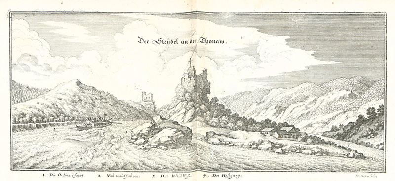 Der Regensburger Strudel – ein gefährliches Hindernis für die frühe Schifffahrt. Darstellung aus dem Jahr 1679. (Universitäts- und Landesbibliothek Düsseldorf, lizenziert via CC0 1.0) HLB