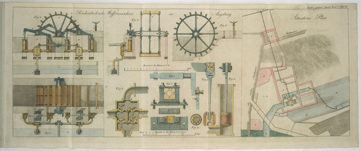 „Reichenbach’sche Wassermaschine in Augsburg“ von Johann Gottfried Dingler (1778-1855) im Polytechnischen Journal 7, 1822. (PDM 1.0 via SLUB Dresden, Technol.A.264-7.1822) HLB