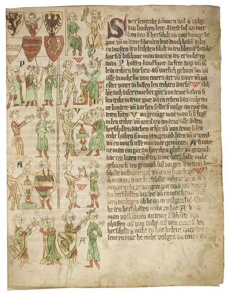 Darstellung von Belehnungen im Heidelberger Sachsenspiegel, Anfang 14. Jahrhundert. (Universitätsbibliothek Heidelberg, Cod. Pal. germ. 164)