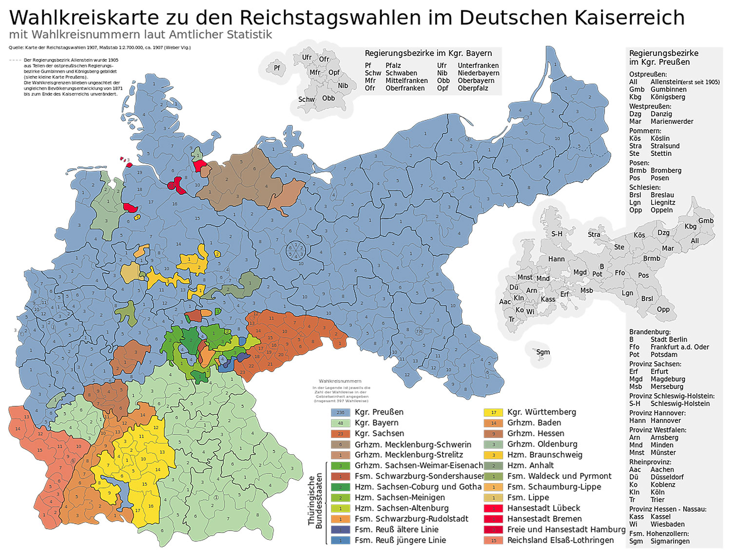Wahlkreiskarte zu den Reichstagswahlen im Deutschen Kaiserreich inklusive der eingetragenen Wahlkreisnummern laut Amtlicher Statistik. (Karte von Maximilian Dörrbecker, lizensiert durch CC BY-SA 3.0 via Wikimedia Commons)