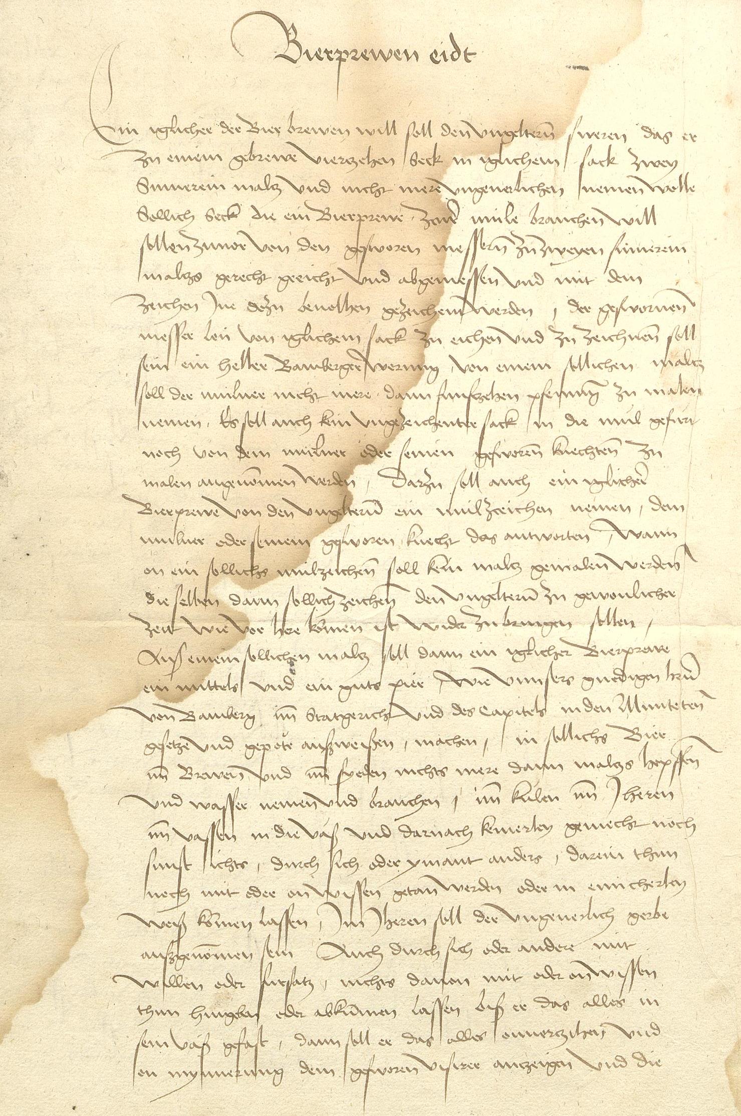 Das Reinheitsgebot für die Stadt Bamberg von 1489, enthalten in der gemeinsam von Bischof, Domkapitel und Stadt erlassenen Ungeldordnung für die Stadt Bamberg. Das Reinheitsgebot ist im Eid der Bierbrauer enthalten. Erlaubt werden die Zutaten Malz, Hopfen, Wasser und Hefe (Zeilen 23-24, 28-29; Staatsarchiv Bamberg, A 91 Lade 449 Nr. 775, fol. 9v).
