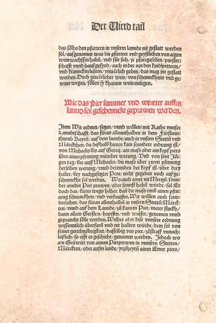 Das bayerische Reinheitsgebot in der durch den späteren Kanzler Leonhard von Eck (1480-1550) verfassten, am 23. April 1516 von den Herzögen Wilhelm IV. und Ludwig X. in Ingolstadt erlassenen Landesordnung. Abb. aus: Das büch der gemeinen. landpot. Landsordnüng. Satzüng. vnd Gebreüch, des Fürstennthumbs. in Obern. vnd Nidern Bairn. Jm Funftzehnhundert vnd Sechtzehendem Jar aufgericht, München 1516. (Bayerische Staatsbibliothek, 2 L.impr.membr. 45, Bl. 36v)