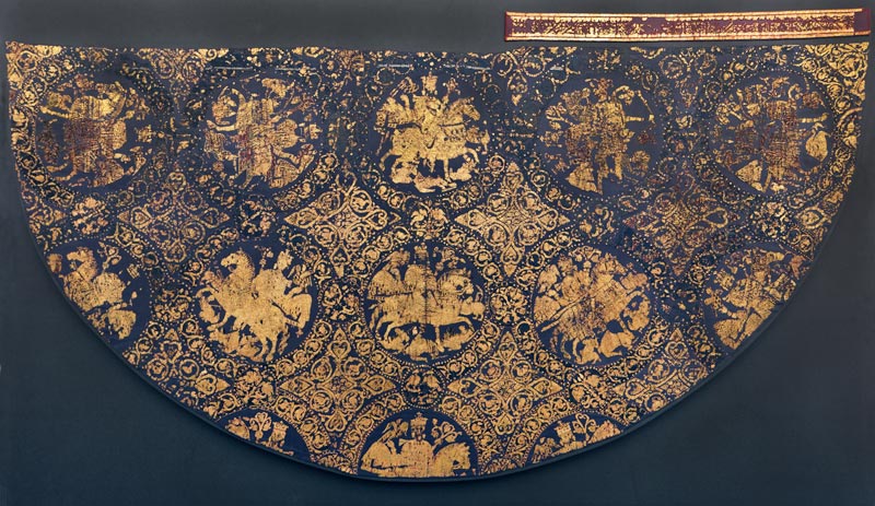 Der Bamberger Reitermantel. Ursprünglich rechteckiger Mantel Kaiser Heinrichs II. (1002-1024) mit Motiven aus östlichen und abendländischen Kulturkreisen. (Diözesanmuseum Bamberg, Inv.Nr. 3.3.0003, Foto: Uwe Gaasch) HLB