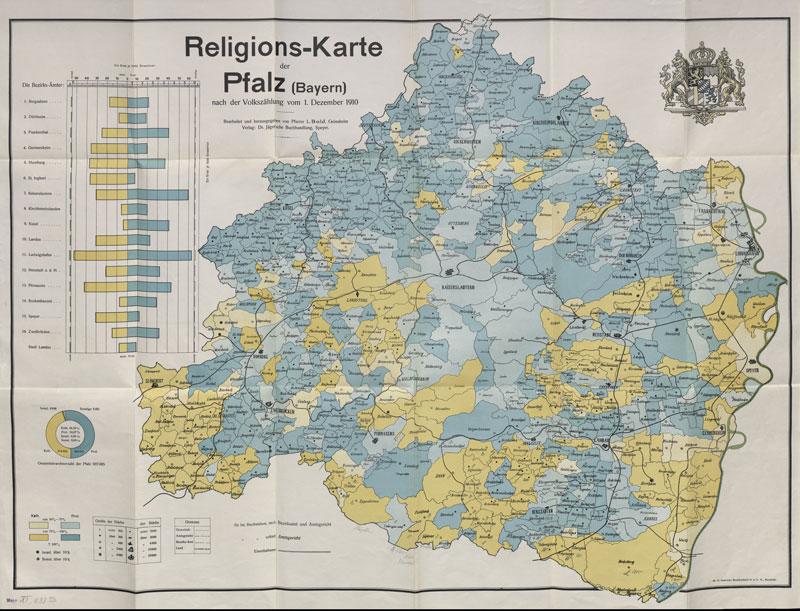Religions-Karte der Pfalz (Bayern) nach der Volkszählung vom 1. Dezember 1910. Bearbeitet und herausgegeben von L. Bold. (Bayerische Staatsbibliothek -- Mapp. XI,233 m) HLB