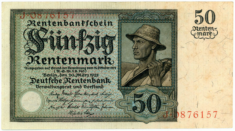 Auf 50 Rentenmark ausgestellter Rentenbankschein vom 20. März 1925, Vorderseite. (HVB Stiftung Geldscheinsammlung, lizenziert durch CC BY-NC 4.0) HLB