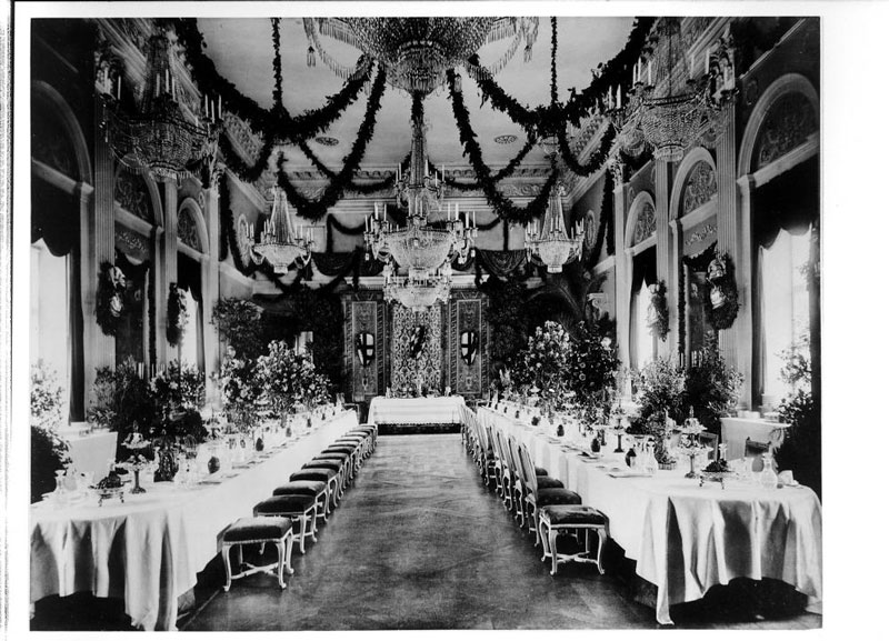 Vorbereiteter Bankettsaal zum St. Georgi-Ritter-Ordensfest im Herkulessaal der Residenz am 23.04.1896. Foto: Georg Böttger (1821-1901). (Stadtarchiv München, C1896088 lizenziert durch CC BY-ND 4.0) HLB