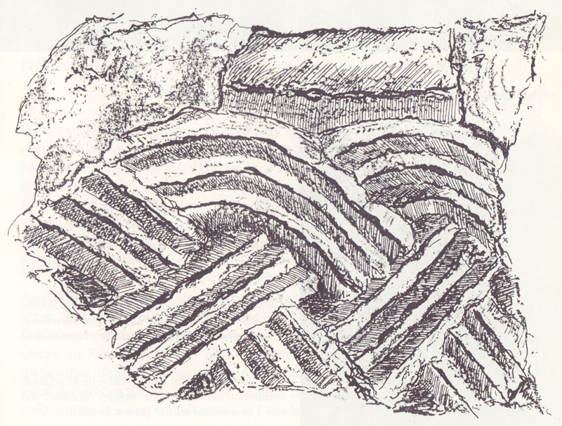 Bruchstück einer Altarschrankenplatte aus Rettenberg St. Georg mit dreizeiligem Flechtwerk und einer Randkante. Kalkstein, um 850. Oberfläche 18 x 13,5 cm. Relieftiefe +/- 6 cm. Abb. aus: Hillar, Irmgard: Eine Kirchengründung aus dem 9. Jahrhundert, aus karolingischer Zeit: Die Kirche St. Georg in Rettenberg bei Friedberg. In: Altbayern in Schwaben, Landkreis Aichach-Friedberg 1986, 9 – 17, hier: 13. (Irmgard Hillar) HLB