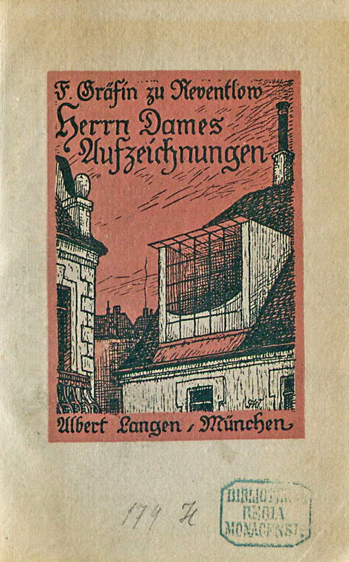 Titelblatt des Romans „Herrn Dames Aufzeichnungen“ von Franziska „Fanny“ Gräfin zu Reventlow (1871-1918), München 1913. (Bayerische Staatsbibliothek, DD.I 608) HLB