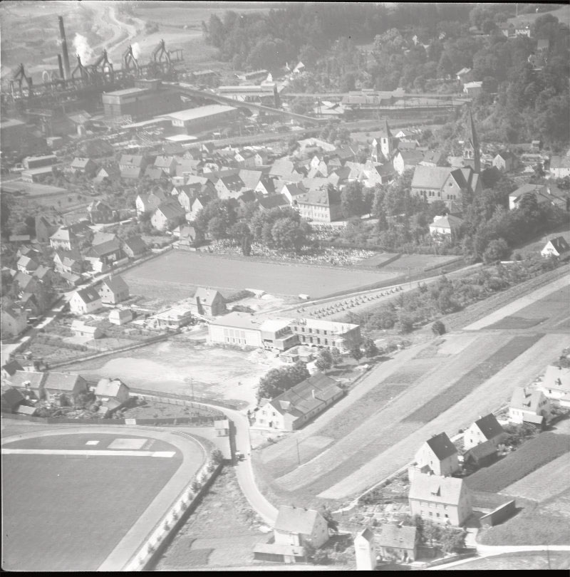 Luftaufnahme des Stadtteils Rosenberg aus den 1950er Jahren, die den dörflichen Charakter Rosenbergs zeigt. Links unten ist das ehemalige "Flick-Stadion" des TuS Rosenberg zu sehen, das bis 2012 nach Friedrich Flick benannt war. (Stadtarchiv Sulzbach-Rosenberg, B 1.1 105-002) HLB
