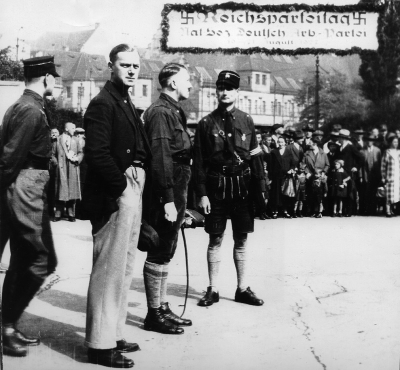 V.l.n.r.: Alfred Rosenberg (1893-1946), Adolf Hitler (1889-1945) und Rudolf Heß (1894-1987) auf dem Reichsparteitag der NSDAP, 19.-21. August 1927 in Nürnberg. Fotografie von Heinrich Hofmann. (Bayerische Staatsbibliothek, Bildarchiv hoff-6805) HLB