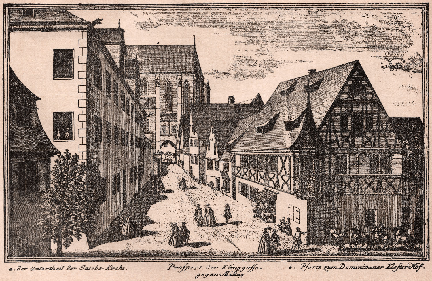 Dieser Stich zeigt die Klinggasse in Rothenburg. Im Hintergrund ist der hintere Teil des Schiffes der St. Jakobs Kirche zu sehen. (aus: von Winterbach, J. D. W.: Rothenburger Chronik, Rothenburg 1905, nach Seite 56)