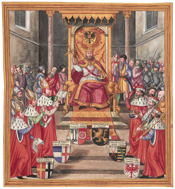 Rudolf von Habsburg (reg. 1272-1291) und die sechs Kurfürsten, die ihn gewählt haben. Miniatur aus: Jakob Fugger, Ehrenspiegel des Hauses Österreich, Augsburg 1555, fol. 103r. (Bayerische Staatsbibliothek, Cgm 895)