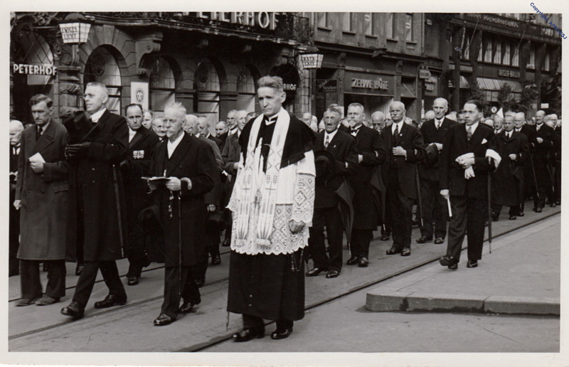 Pater Rupert Mayer SJ (1876-1945) bei einer Fronleichnamsprozession vor dem Münchner "Ratscafé" im Peterhof, ca. Mitte der 1930er Jahre. Der am 3. November 1987 seliggesprochene Pater Rupert Mayer SJ kritisierte das NS-Regime öffentlich. (SJ-Bild) HLB