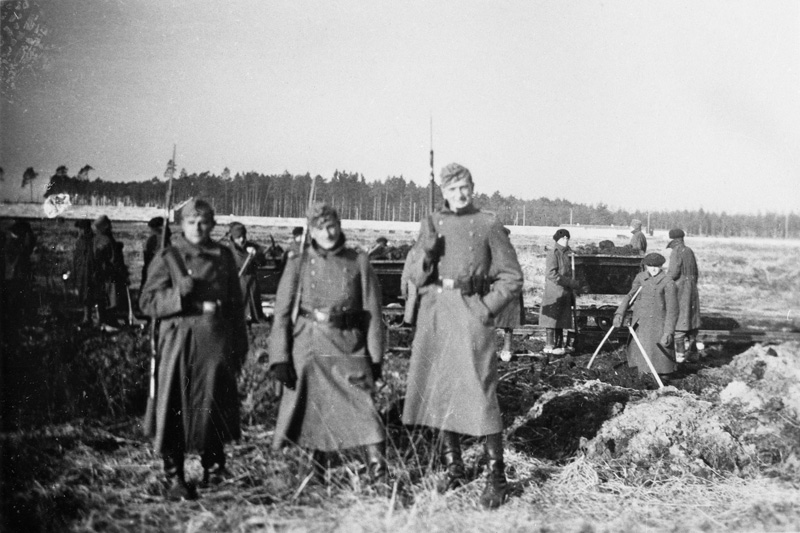 Foto russischer Kriegsgefangener mit Wachposten auf der Baustelle Märzfeld, November 1941. Das Lagerareal wurde im Krieg als Lager für Kriegsgefangene unterschiedlicher Herkunft genutzt. Bei Zwangsarbeit auf dem Märzfeldgelände kamen im Winter 1941/42 900 russische Kriegsgefangen um. (Dokumentationszentrum Reichsparteitagsgelände/Karl Bach Ph-0401-18) HLB