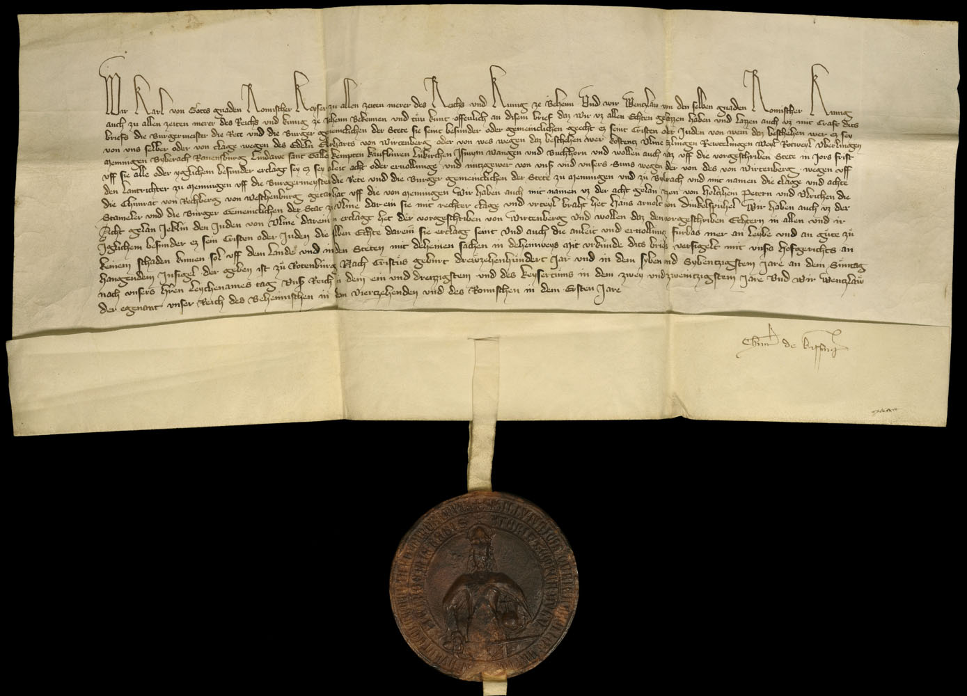 31. Mai 1377: Kaiser Karl IV. und sein Sohn, König Wenzel, erklären, dass sie die Bürger und Gemeinschaften der Städte Ulm, Esslingen, Konstanz, Reutlingen, Rottweil, Weil, Überlingen, Memmingen, Biberach, Ravensburg, Lindau, St. Gallen, Kempten, Kaufbeuren, Leutkirch, Isny, Wangen und Buchhorn, die sich gegen sie gestellt haben, trotz dieser Widersetzlichkei wieder in ihre Gnade genommen haben. (Baden-Württemberg Landesarchiv, Hauptstaatsarchiv Stuttgart H 51 U 846)