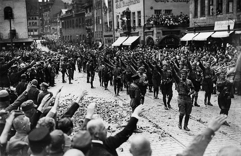 Aufmarsch der SA während des Reichsparteitags der NSDAP auf dem Nürnberger Hauptmark 1929. (Bayerische Staatsbibliothek, Bildarchiv hoff-6802)