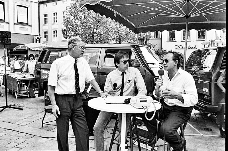 Foto aus dem Wahlkampff der SPD für die Europwahl 1989 mit Hans deWith (geb. 1932) und Heinz Köhler (geb. 1942) am Grünen Markt in Bamberg. Foto: Emil Bauer. (Stadtarchiv Bamberg) HLB