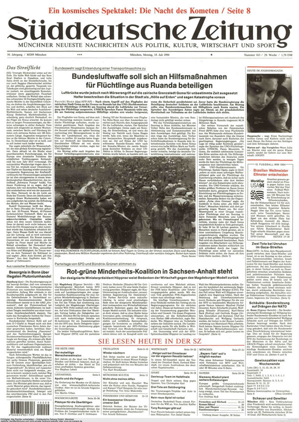 Titelseite der SZ vom 18.7.1994. (Süddeutsche Zeitung Archiv) HLB