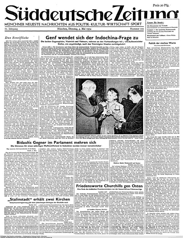 Titelseite der SZ vom 4.5.1954. (Süddeutsche Zeitung Archiv) HLB