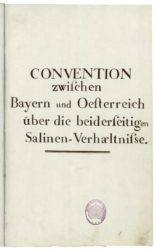 Titelblatt der Konvention zwischen Bayern und Österreich über die beiderseitigen Salinenverhältnisse vom 18. März 1829. (Bayerisches Hauptstaatsarchiv, Bayern Urkunden 3582)