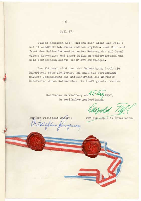Abkommen zwischen dem Freistaat Bayern und der Republik Österreich über die Anwendung der Salinenkonvention vom 25. März 1957. Seite 6 mit den Unterschriften des bayerischen Ministerpräsident Wilhelm Hoegner (SPD, 1887-1980, Ministerpräsident 1945-1946, 1954-1957) und des österreichischen Außenministers Leopold Figl (ÖVP, 1902-1965, Bundeskanzler 1945-1953, Außenminister 1953-1959). (Bayerisches Hauptstaatsarchiv, Bayern Urkunden 4007)