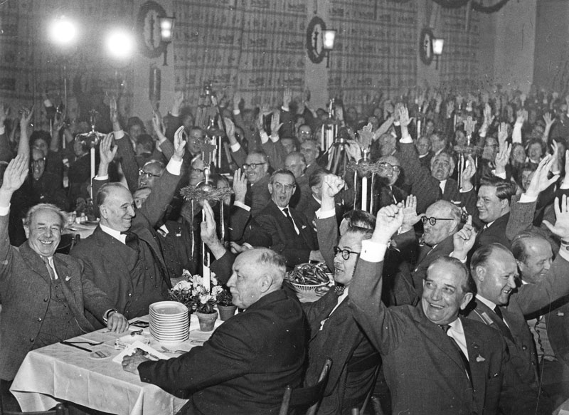 "Wer will Salvator?", Abstimmung bei der Salvatorprobe 1959. Oberbürgermeister Thomas Wimmer vorne in der Mitte (1887-1964) mit Wilhelm Hoegner vorne links (1887-1980, SPD) neben Josef Müller (1898-1979, CSU). Foto Berthold Fischer. (Bayerisches Wirtschaftsarchiv F145, 1930) HLB