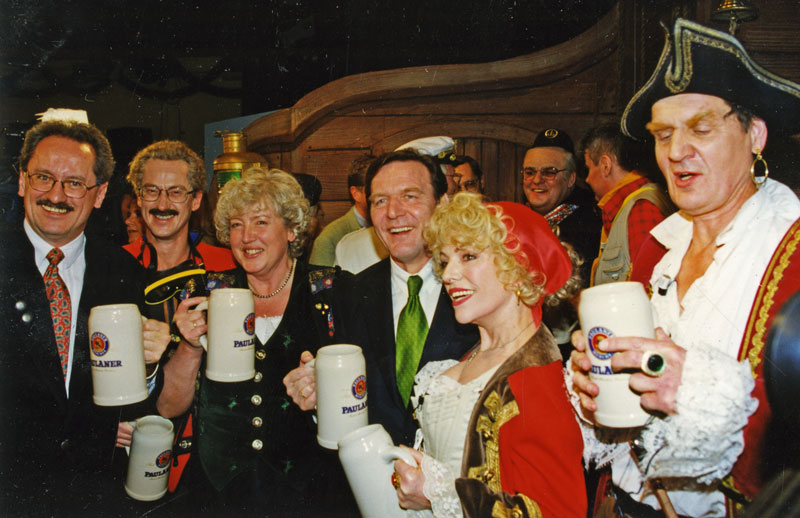 Politiker und Mitwirkende der Salvatorprobe von 1998. Von links: Oberbürgermeister Christian Ude mit seinem Double Ulli Bauer, Renate Schmidt und Gerhard Schröder mit ihren Doublen Veronika von Quast und André Hartmann. (Bayerisches Wirtschaftsarchiv F145, 4632) HLB