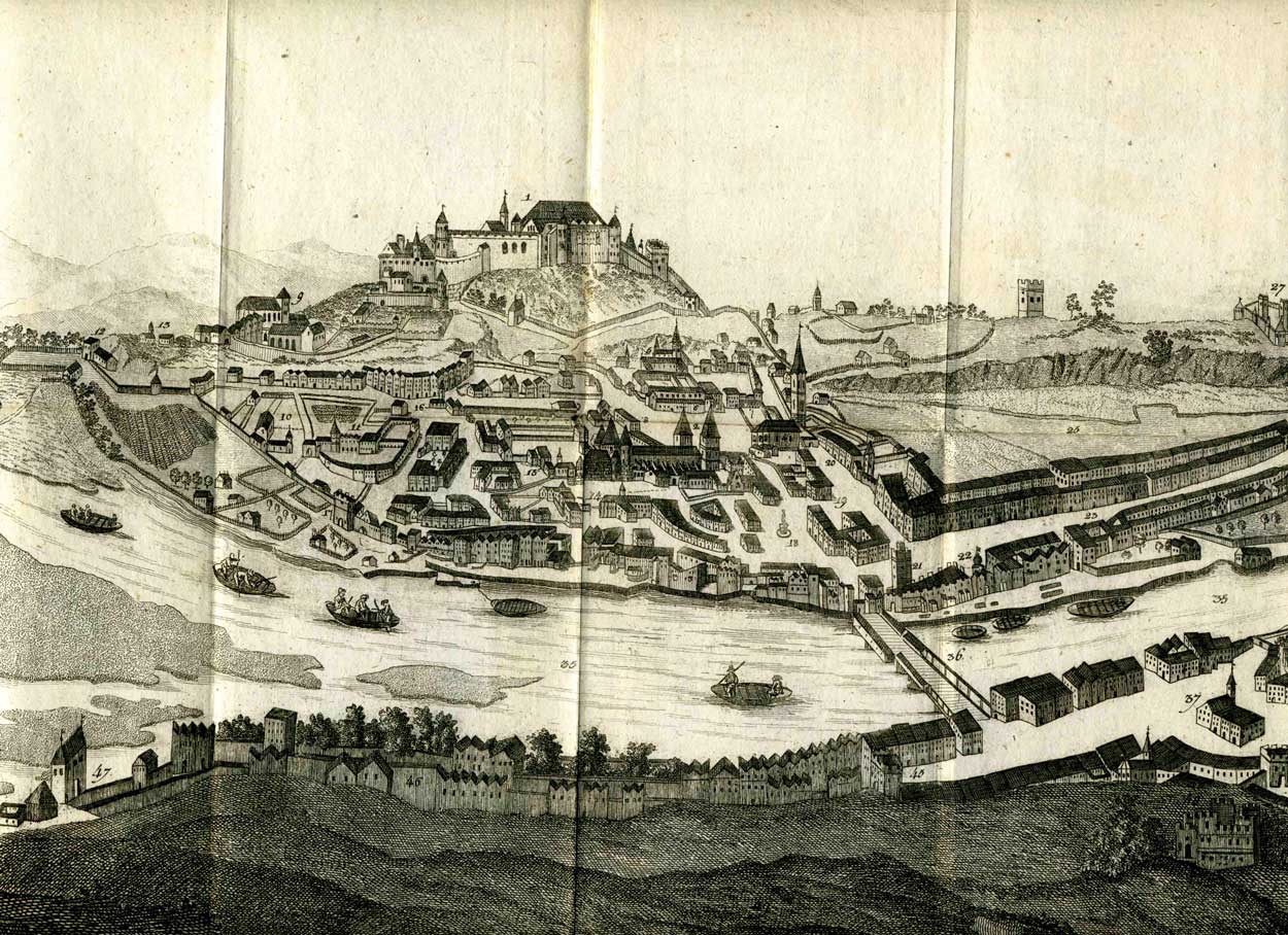 Salzschiffe auf der Salzach bei Salzburg. Kupferstich von Ch. J. C. Wirsing, um 1792. (Stadtarchiv Bad Reichenhall) HLB