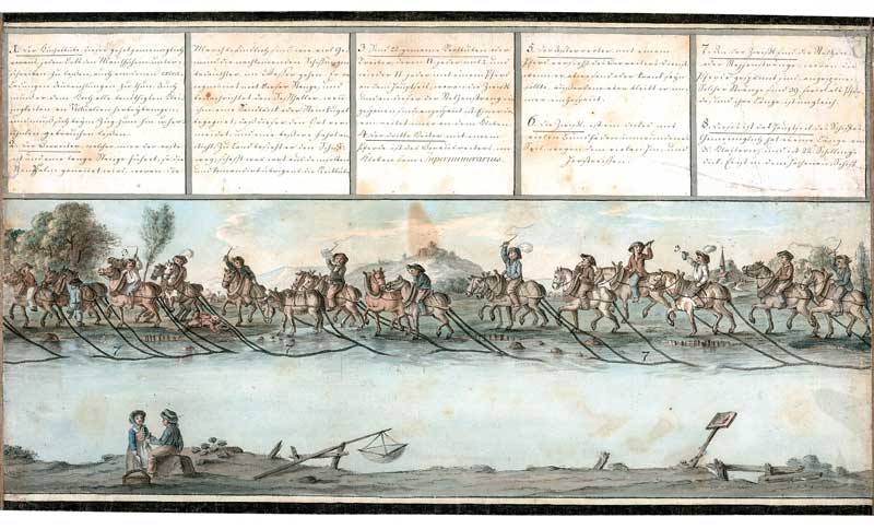 Darstellung eines kurbayerischen Salzschiffszuges auf der Donau, c. 1773. Der über 3 Meter lange Bildprospekt zeigt viele Details und den Aufwand solche Schiffszüge flussaufwärts von St. Nikola bei Passau bis zu den Umschlagplätzen (u.a. in Stadtamhof bei Regensburg) zu treideln. Vier Transportschiffe sowie mehre mehrere Beischiffe konnten bis zu 4500 Zentner Salz laden und benötigten bis zu 50 Personen zu Wasser und Land. Auf dem zweiten Bildabschnitt ist der Treidelzug zu erkennen. Die Pferde zogen den Schiffszug mittels eines Seiles. (Museen der Stadt Regensburg, GN 1994-2) HLB
