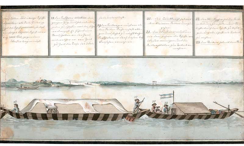 Darstellung eines kurbayerischen Salzschiffszuges auf der Donau, c. 1773. Der über 3 Meter lange Bildprospekt zeigt viele Details und den Aufwand solche Schiffszüge flussaufwärts von St. Nikola bei Passau bis zu den Umschlagplätzen (u.a. in Stadtamhof bei Regensburg) zu treideln. Vier Transportschiffe sowie mehre mehrere Beischiffe konnten bis zu 4500 Zentner Salz laden und benötigten bis zu 50 Personen zu Wasser und Land. Der fünfte Bildabschnitt zeigt nach einem weiteren Transportschiff das sog. Kuchlschiff, welches der Verpflegung der Mannschaft diente und sich in der Mitte des Zuges befand. (Museen der Stadt Regensburg, GN 1994-2) HLB