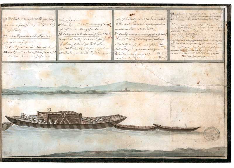 Darstellung eines kurbayerischen Salzschiffszuges auf der Donau, c. 1773. Der über 3 Meter lange Bildprospekt zeigt viele Details und den Aufwand solche Schiffszüge flussaufwärts von St. Nikola bei Passau bis zu den Umschlagplätzen (u.a. in Stadtamhof bei Regensburg) zu treideln. Vier Transportschiffe sowie mehre mehrere Beischiffe konnten bis zu 4500 Zentner Salz laden und benötigten bis zu 50 Personen zu Wasser und Land. Auf dem letzten Bildabschnitt ist die sogenannte Fuderzille dargestellt. Das Boot führte das Futter für die Pferde mit. (Museen der Stadt Regensburg, GN 1994-2) HLB