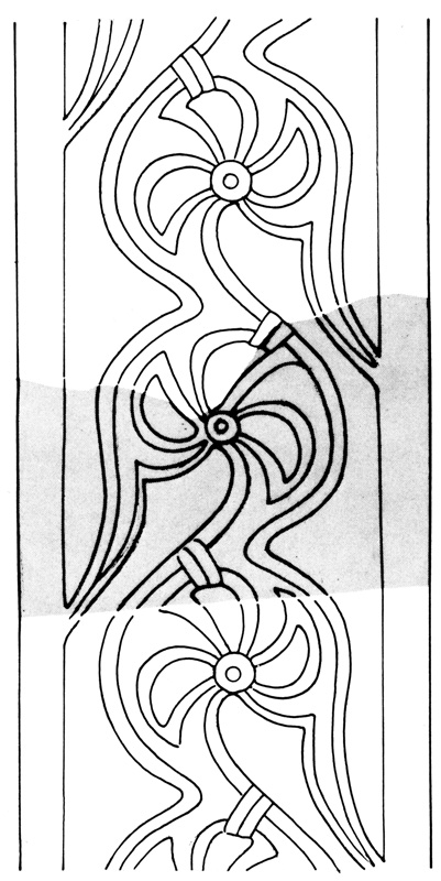 Rekonstruktionsvorschlag für ein Fragment. Fundort: Kloster und Kirche St. Benediktus, Sandau. Abb. aus: H. Dannheimer: Steinmetzarbeiten der Karolingerzeit, München 1980, 68. (Hermann Dannheimer) HLB