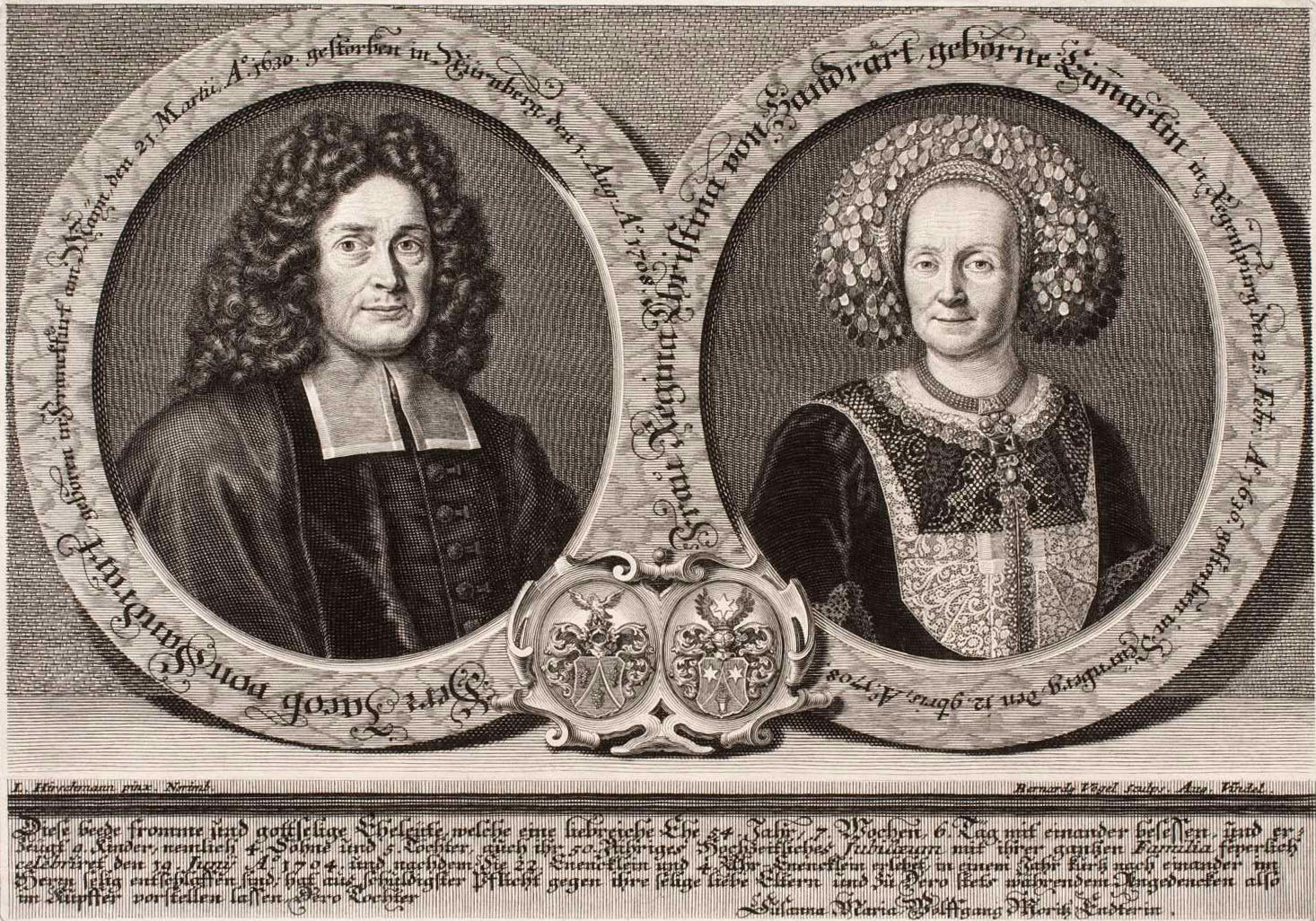 Jakob von Sandrart (1630-1708), der erste Direktor der Nürnberger Akademie der Bildenden Künste, hier dargestellt neben seiner Ehefrau Regina Christina (1636-1708) auf eine Stich von Bernhard Vogel. (Porträtsammlung der Herzog August Bibliothek Wolfenbüttel A 18673)