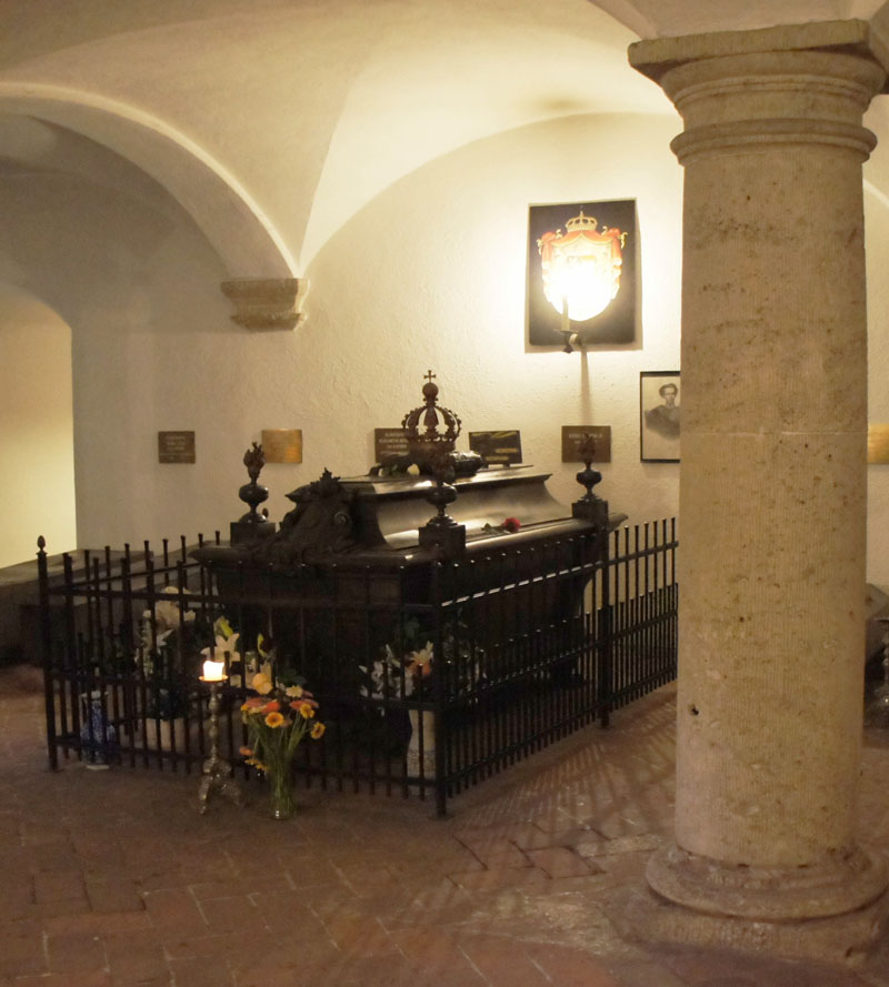Sarkophag Ludwigs II. in der Gruft der Michaelskirche in München. (Foto: Wolfgang Rieger lizenziert durch CC BY-SA 3.0 Deed via Wikimedia Commons, bearbeitet) HLB