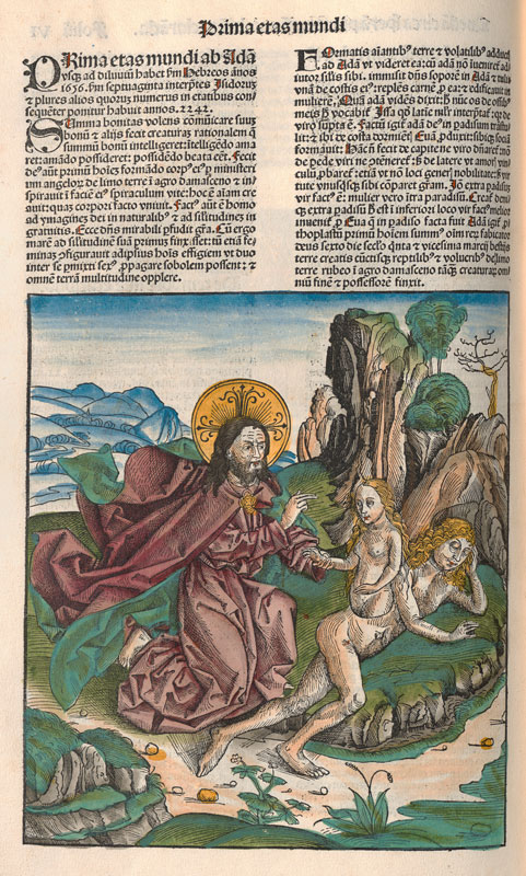 Darstellung des ersten Weltzeitalters. Abb. aus: Hartmann Schedel, Liber Chronicarum, Nürnberg 1493, fol. 6v. (bavarikon) (Bayerische Staatsbibliothek, 2 Inc.c.a. 2919)