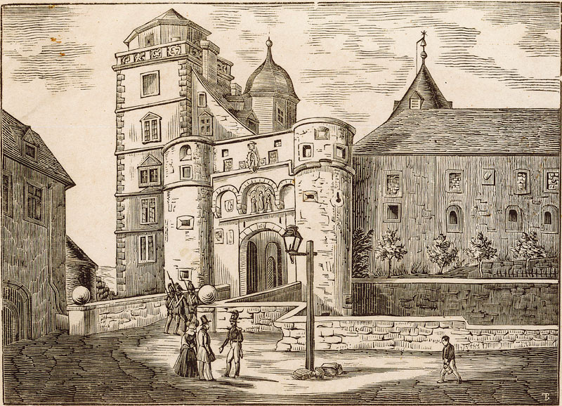 Ansicht des Scherenbergtors nach dem Brand von 1840 noch ohne Dächer. Holzschnitt von Thomas Bauer von 1843. (Fotoarchiv Museum für Franken in Würzburg, Inventarnummer 47008, Leihgabe der Stadt Würzburg im Museum für Franken in Würzburg) HLB