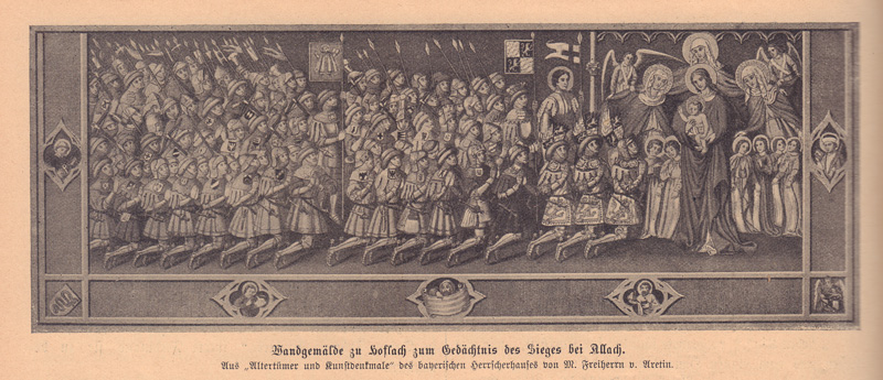 Gesamtansicht des kurze Zeit nach der Schlacht geschaffenen Wandfreskos in der Kapelle von Hoflach. Von rechts nach links: die heilige Sippe, die Herzöge von Bayern-München unter dem Geleit des hl. Georg, das ritterliche Gefolge (kniend) und das bürgerliche Aufgebot. Abb. aus: Das Bayerland, Nr. 40, 11. Jahrgang 1900, 472. (Bayerische Staatsbibliothek, 4 Z 40.173-11) HLB