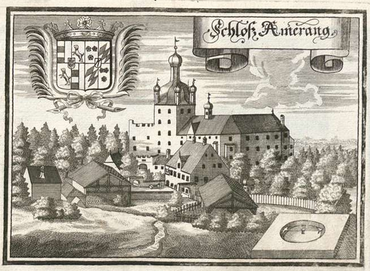 Seit dem Ende des 15. Jahrhunderts war Schloß Amerang Hauptsitz der Herren von der Leiter. (Michael Wening, Historico-Topographica Descriptio. 2. Band, München 1721, Bayerische Staatsbibliothek)