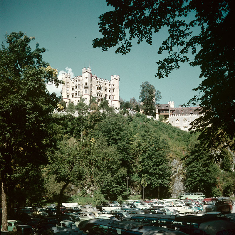 Das unter König Maximilian II. (reg. 1848-1864) errichtete Schloss Hohenschwangau ist noch heute neben dem benachbarten Schloss Neuschwanstein ein bedeutendes touristisches Ausflugsziel. Seit 1923 befindet es sich im Eigentum des Wittelsbacher Ausgleichsfonds. Foto aus dem Jahr 1960 von Georg Fruhstorfer (1915-2003). (Bayerische Staatsbibliothek, Bildarchiv fruh-16570)
