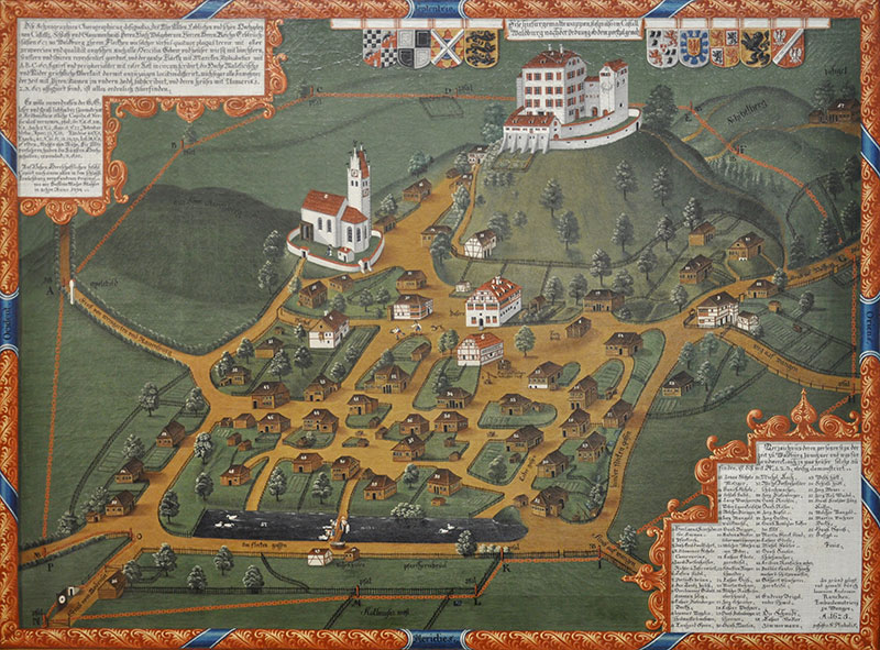 Schloss Waldburg und der gleichnamige Ort. Kopie eines Gemäldes von Joahnn Andreas Rauch (1575-1632). (Gemeinfrei via Wikimedia Commons)