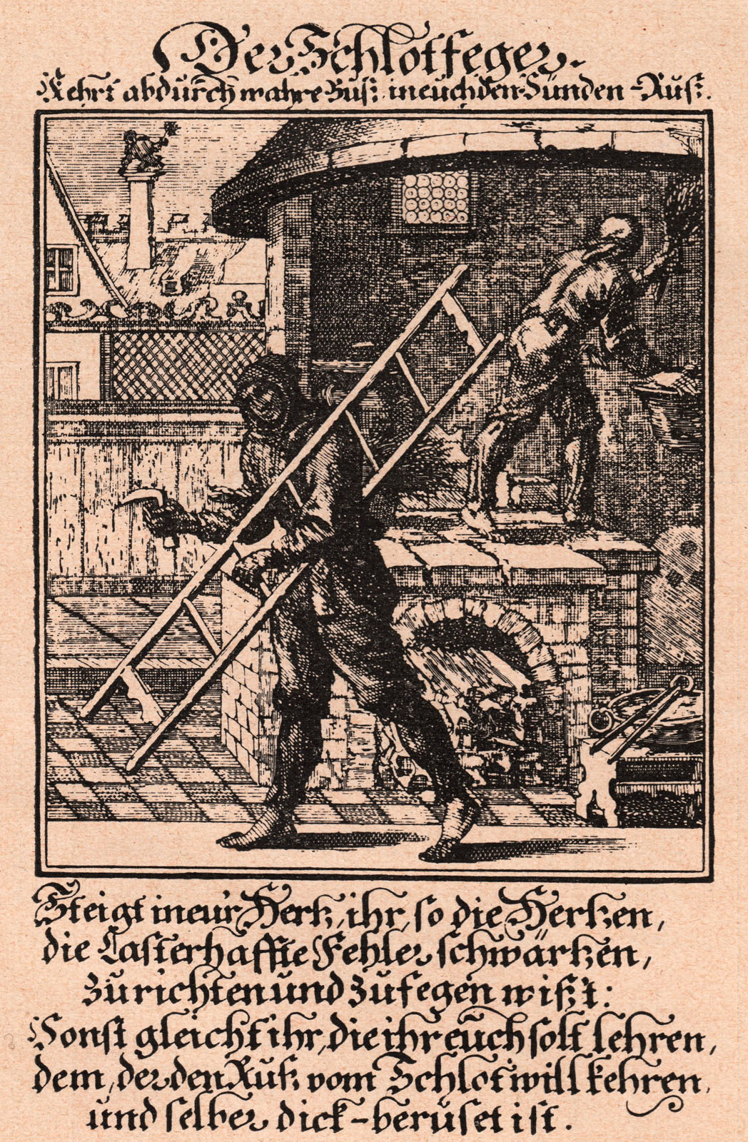 Darstellung eines Schlotfegers in Christoph Weigels "Abbildung der gemeinnützlichen Hauptstände", Regensburg 1698. (aus: Goetz, Hans: Das bayerische Handwerk, in: Das Land Bayern. Seine kulturelle und wirtschaftliche Bedeutung für das Reich, München 1927, S. 187)