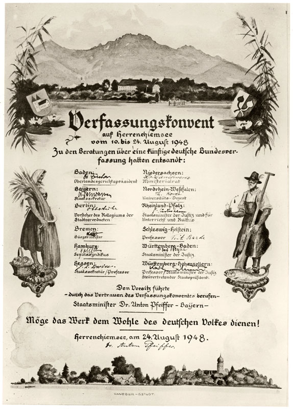 Schmuckblatt zur Erinnerung an den Verfassungskonvent auf Herrenchiemsee am 24. August 1948. (Bayerisches Hauptstaatsarchiv, Nachlass Ehard 1154)