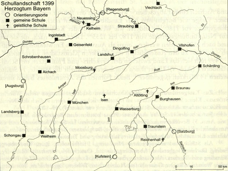 Schullandschaft im Herzogtum Bayern 1399 (Karte von Reinhard Jakob (Entwurf) u. F. G. Weinrich (Kartographie) aus: Flachenecker, Helmut u. Kiessling, Rolf (Hrsg.):Schullandschaften in Altbayern, Franken und Schwaben. Untersuchungen zur Ausbreitung und Typologie des Bildungswesens in Spätmittelalter und Früher Neuzeit, München 2005, S. 164.)