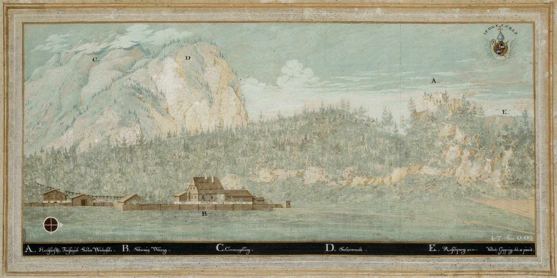 Valentin Gappnigg (1661/62-1736): Schwaige Wang, Sitz der Pflegsverwaltung (1632-1752), mit dem dahinterliegenden Schlossberg und der Ruine des Schlosses Werdenfels (rechts oben), Vedute aus dem Freisinger Fürstengang-Zyklus (1696-1702), 1700. (Diözesanmuseum Freising P 383, Foto: Walter Bayer)