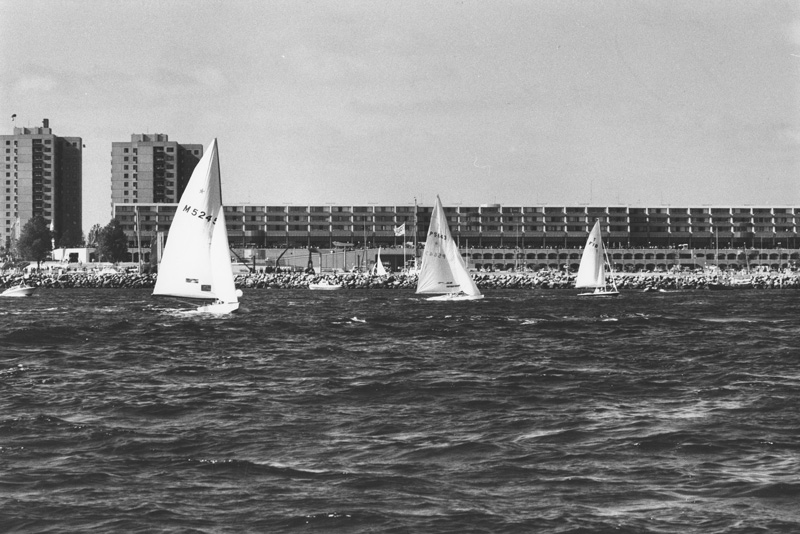 Im von 1969 bis 1972 errichten Olympiazentrum im Kieler Ortsteil Schilksee fanden während der Sommerspiele die 16 Segelwettbewerbe statt. (Bayerische Staatsbibliothek, Bildarchiv rie-000088) HLB